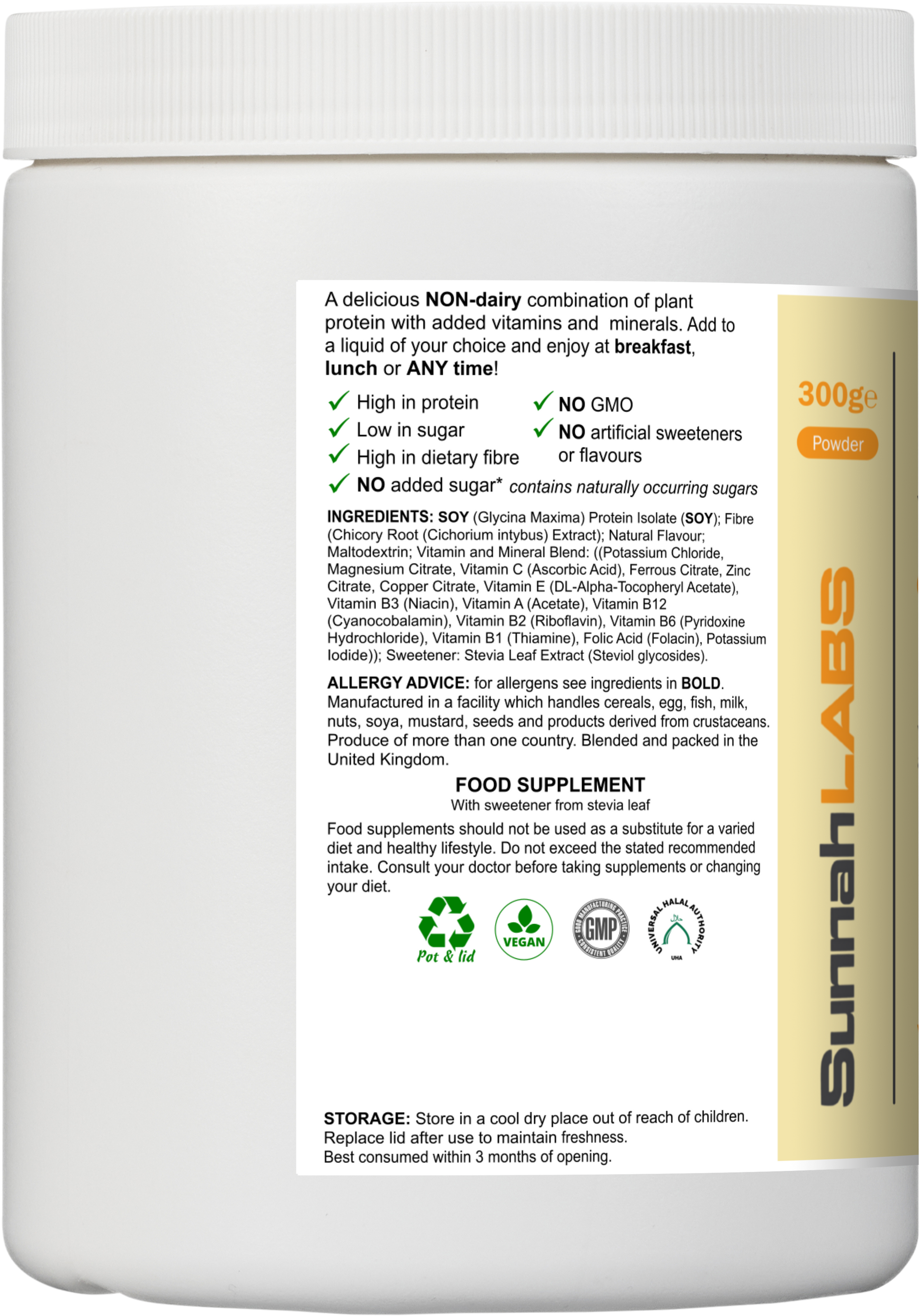 A dairy-free, gluten-free Halal, Vegan meal shake and non-GM soy protein isolate protein powder that has been fortified with vitamins and minerals.